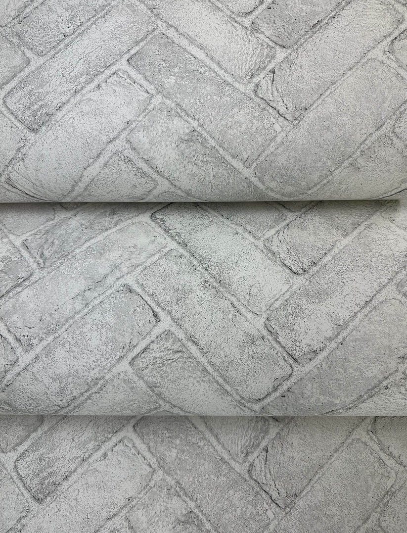 Create a striking feature wall that blends rustic charm with modern design using the Chesapeake Wildflower Cannelle Brick Herringbone Wallpaper in White. This textured wallpaper replicates the look of white and grey bricks arranged in a classic herringbone pattern, adding dimension and architectural interest to any room without the cost or permanence of real brick.