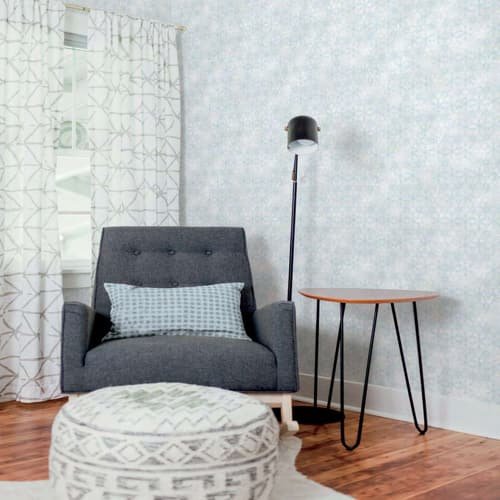 A geometric Living Room Wallpaper with cool Frosted Blue Gray. Contemporary and clean styling.