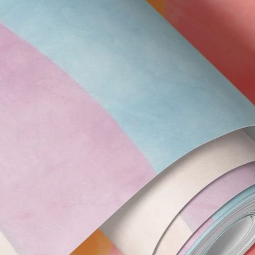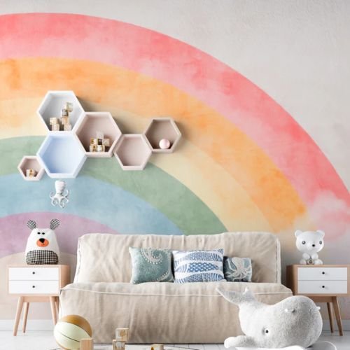 Watercolor Kids Room Wallpaper featuring pastel rainbows in peach, mint, and lavender tones. A gentle touch for whimsical décor.